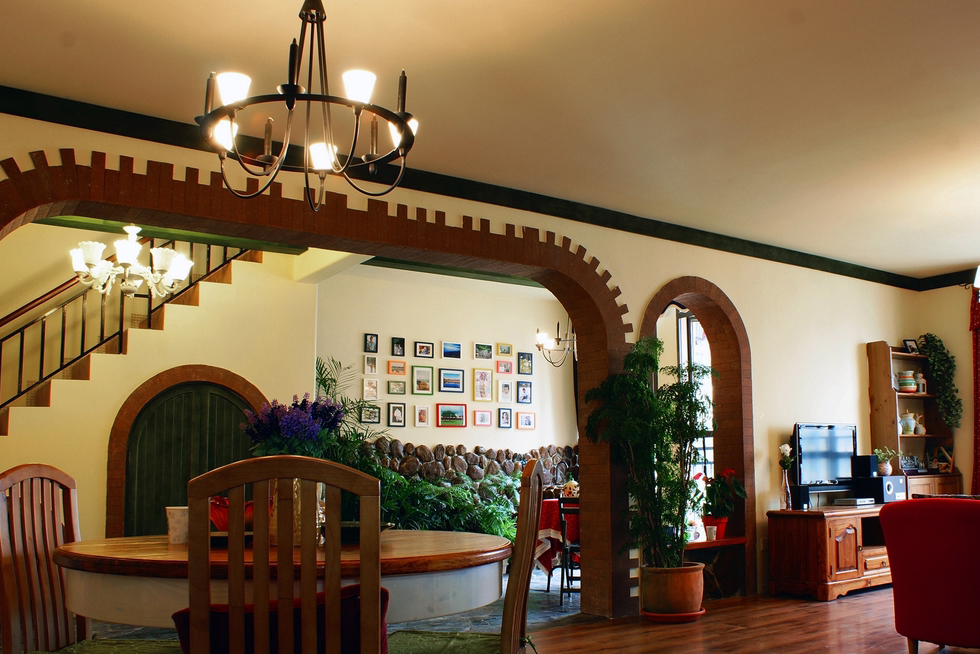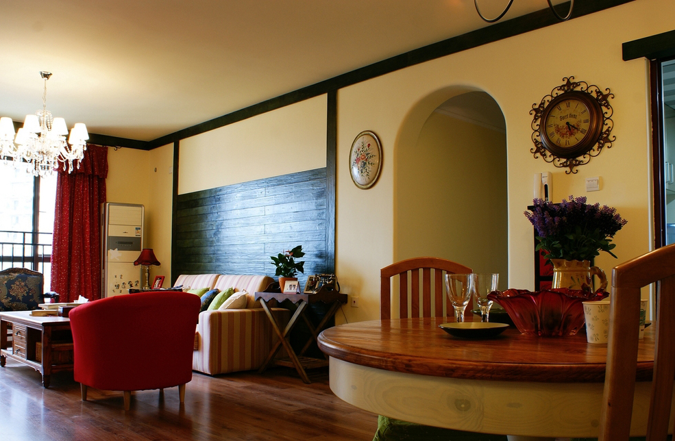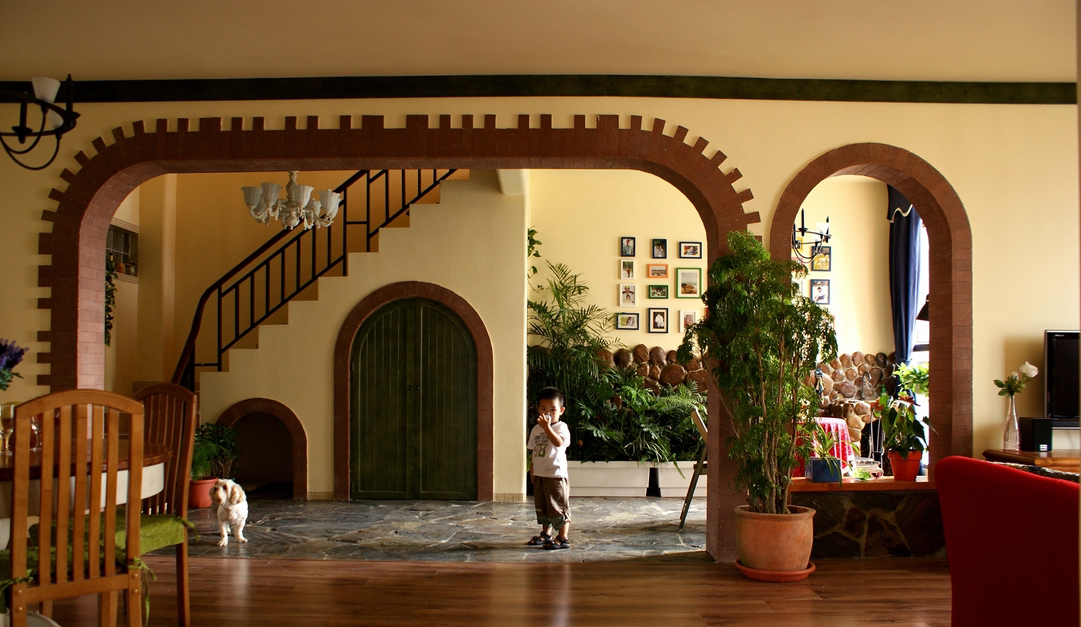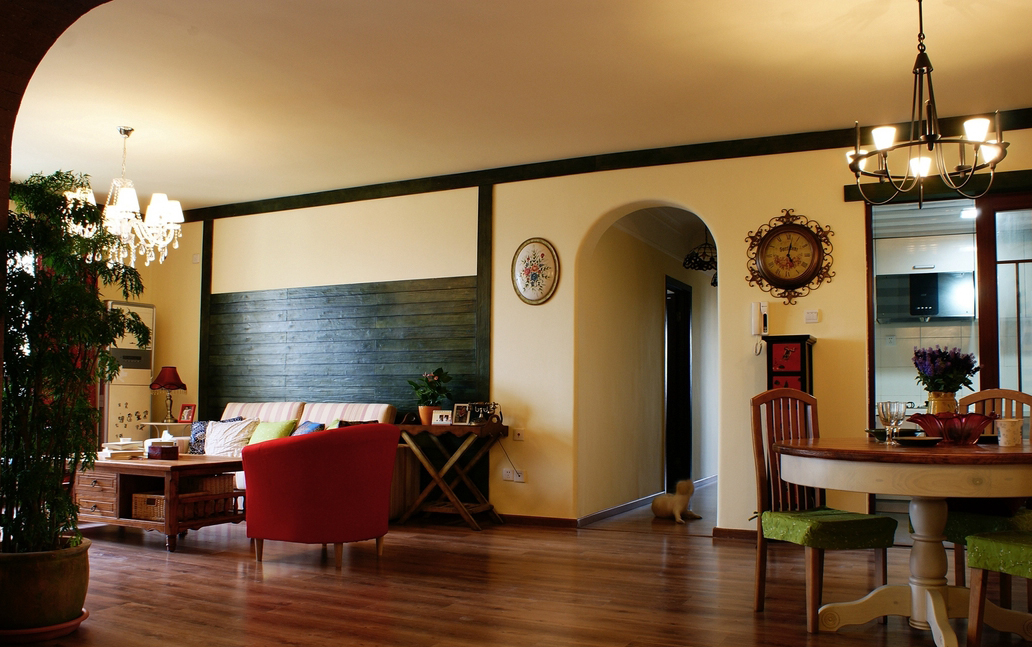 “北緯23.5度、南緯23.5度之間,分布著綠色宮殿般的熱帶雨林。從散布巖石小山的低地平原,到溪流縱橫的高原峽谷,參天的大樹、纏繞的藤蘿、繁茂的花草...多樣的地貌和植物,交織出形態萬千的雨林景觀...” “熱帶雨林季風氣候下,磚紅壤以顏色類似燒制的紅磚而得名。”整個設計思路,由熱帶雨林的這兩個特征全面展開...... 業主愛蜜蓮熱愛大自然,花草,書籍,電影,音樂...“軟裝飾設計環節”中的每樣配飾都極為重視和熱心(這是形成一個完整設計作品的關鍵環節)。步入愛蜜蓮的家,像進入一片熱帶雨林,大朵大朵花兒凝成了“熱情”的窗簾、沙發和臺布,精心挑選的植物和墨綠的原木裝飾,流動著綠意盎然的自然主義休閑精神......