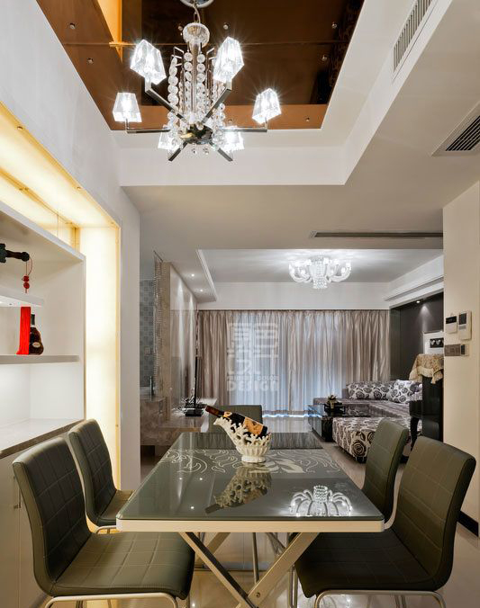 接手本案例時業主工程已經進行到木作。整個空間設計上只能不改動原有的大體格局的情況下,在后期的木作和軟裝去調整,設計手法的運用上試著用純粹干凈的線條搭配出溫馨柔和的自然色調。原有的入戶空間與餐廳空間、客廳背景與洗手干區在造型、色彩與材質上相互的銜接,讓空間巧妙融合。入戶玄關的暗門上運用了密度板的樓花造型,深色茶鏡在樓花的造型映襯上顯的格外的靈動。并于吊頂相互的銜接,使得天花的視覺上有了無限延伸效果,餐廳處備餐柜兼具實用與隔斷功能,周邊的柱子運用透光云石的修飾,備餐柜成為了餐廳空間的主軸。客廳空間電視柜的石頭臺面貫通至洗手臺處,高低錯落感讓臺面凸顯出層次。削弱了單一感。幾只蝴蝶的掛簾給空間帶來了生活的情趣感。