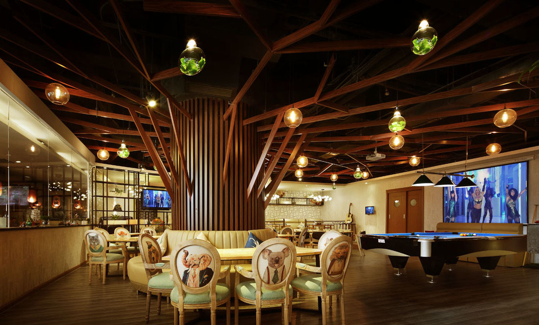 我們將原來的室內裝修拆除,大廳中間的混凝土圓柱是較難處理的。直徑約1.6米的圓柱占住了大廳相當一部分空間。設計師動了一番心思,圍繞圓柱布置沙發卡座,用木紋的鋁合金方通將圓柱裝飾起來,并延伸到天花上,四處發散,如同一棵參天大樹,根深葉茂,天花上再裝飾一些玻璃圓球燈,圓球立面有綠色植物裝飾,使得整個空間一下子活躍起來,原來作為障礙的圓柱變成了整個空間最濃筆重抹的部分。家具是設計師幫助挑選和購買的,力求和空間水**融,每個靠背和抱枕都有不同的圖案花紋,彰顯出細節的追求。